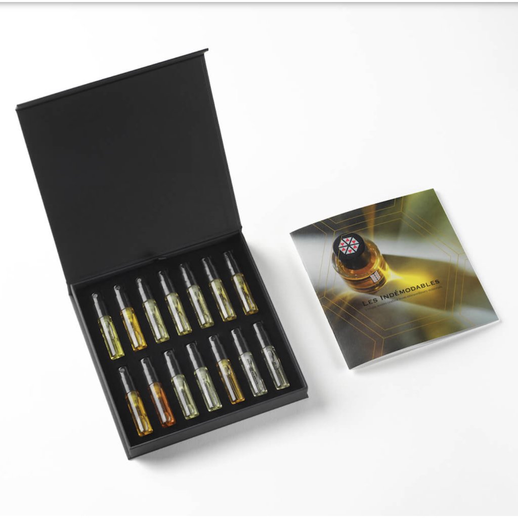 Všechny vůně Les Indémodables k vyzkoušení. Discovery set obsahuje vzorky parfémů, které pro značku vytvořili Florence Fouillet Dubois a Antoine Lie. Kromě vzorků všech vůní z kolekce Eau de Parfum jsou součástí i dva vzorky z kolekce Eau de Cologne.